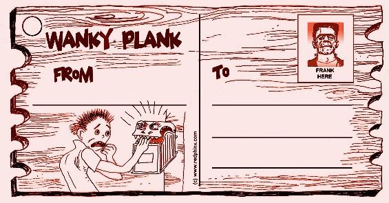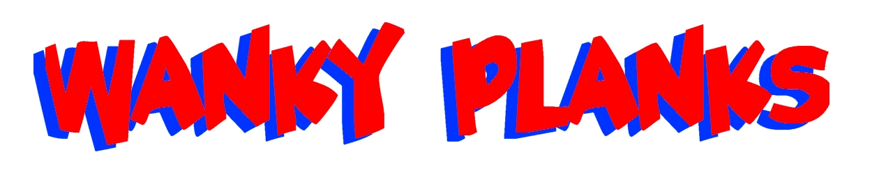 Wanky Planks - Set One, twenty (20) numbered cards. Collect ’em all! One pound each, or €1.20, or $ 1.50 [cheap) Or buy all 20 cards* with a wrapper signed by the artist at 10% discount! The weakest imaginable humour at a sensational price! Fee-fi-faux!!! On quality card, size 16.8 cm x 9 cm